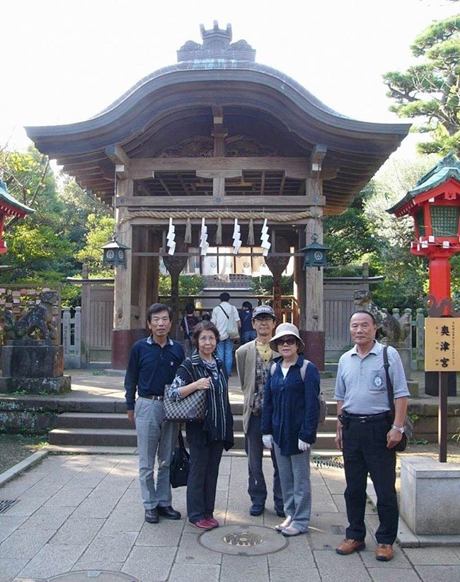 江の島神社は辺津宮、中津宮、奥津宮社からなり、階段を上り下りしながら奥津宮までたどり着き本殿の前で記念写真を撮りました。