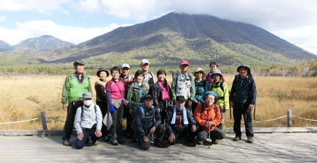 戦場ヶ原の一面の草紅葉を堪能、男体山をバックに集合写真を1枚。