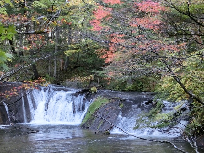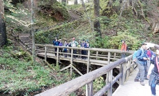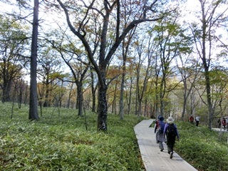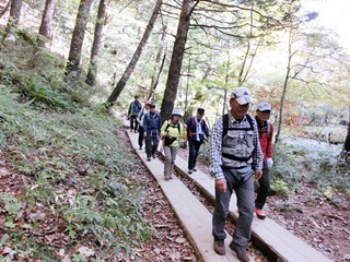 紅葉が始まりだしたブナ林を抜け湯滝方面へ。爽やかな秋の空気と森林浴で皆さんの足取りも快調です。
