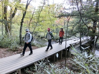 1日目は9時熊谷体育館前を出発、奥日光「赤沼」バス停駐車場へ。紅葉見頃情報のテレビ案内等で途中渋滞もあり13時に到着でした。身支度を整え赤沼から出発です。