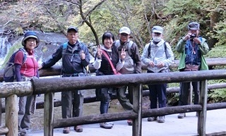 またまた集合写真を1枚。滝の脇を少し上ると湯滝上です。