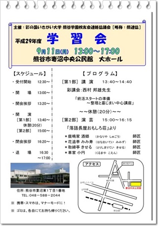 平成29年9月11日(月)13:00~17:00 熊谷市妻沼中央公民館大ホール