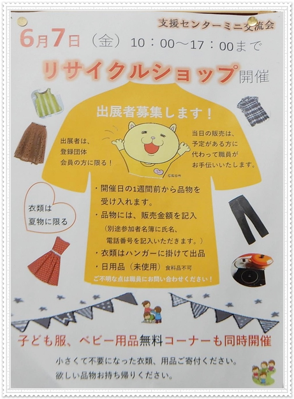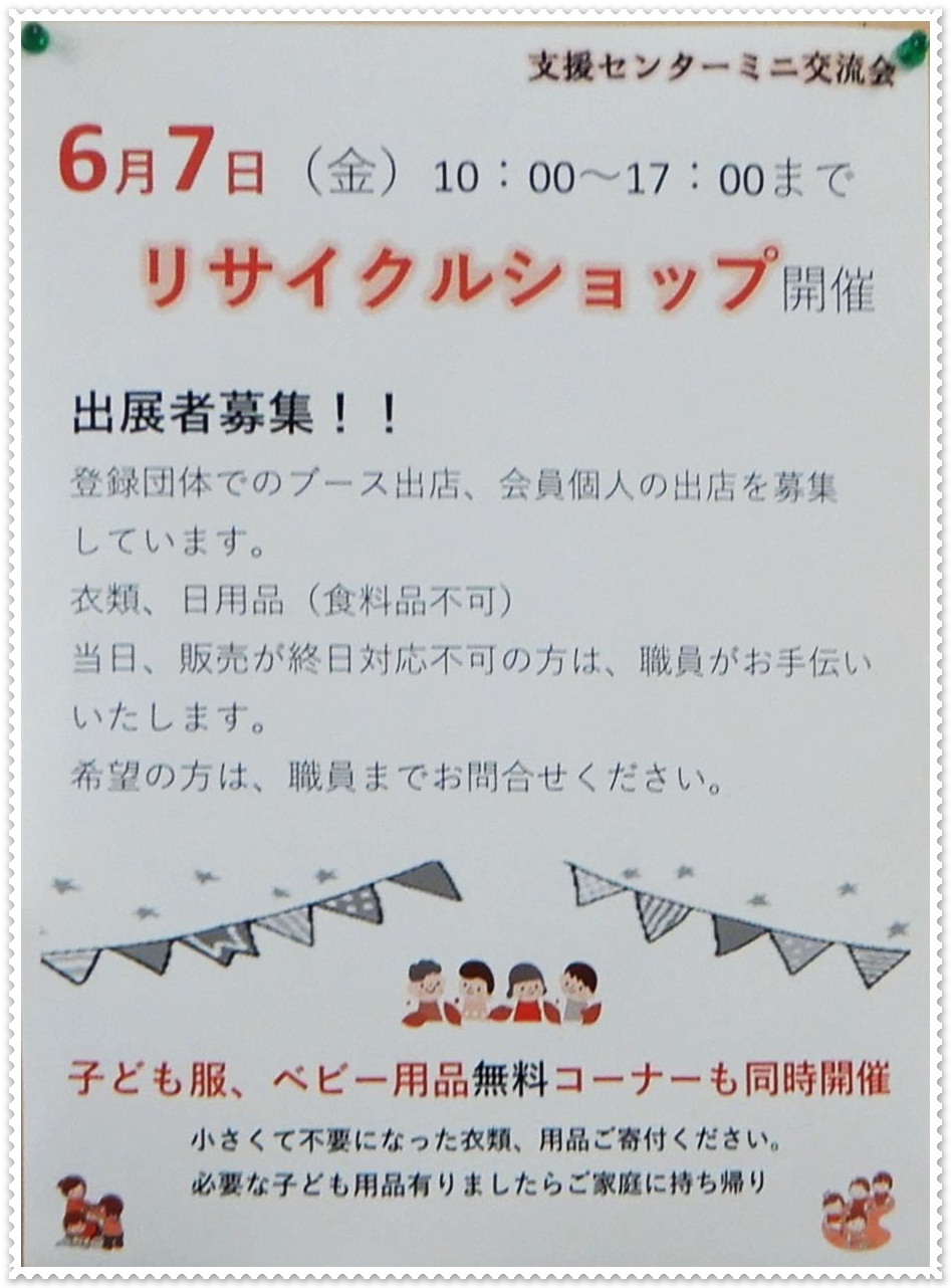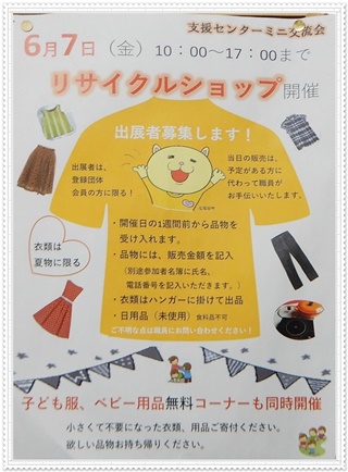 熊連協・各期校友会の活動拠点熊谷市立市民活動支援センターでリサイクルショップが開催されます。広報部では、今年度の事業計画として、ミニ交流会を開催する運びになりました。熊連協の方々の参加出品をお願い致します。熊連協会員であれば何方でも参加頂けます。又当日の販売につきましては、職員が代わって対応は致しますので振って参加下さい。