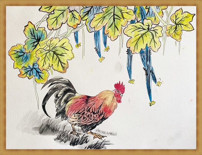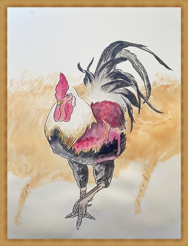 (ヘチマと鶏―1(水彩画))
