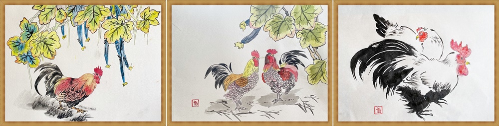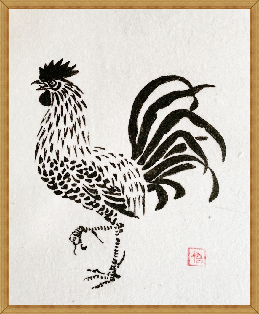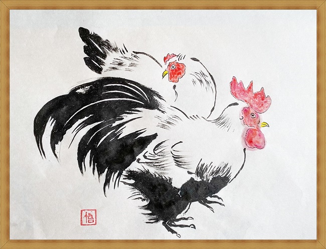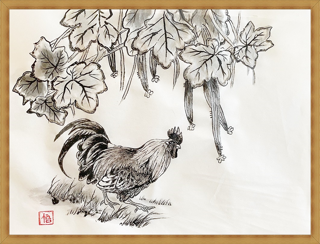 (ヘチマと鶏―2(水墨画))