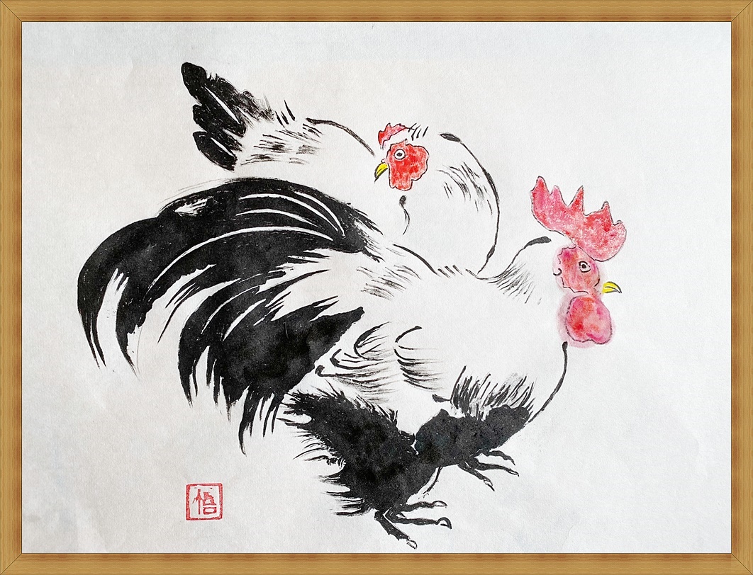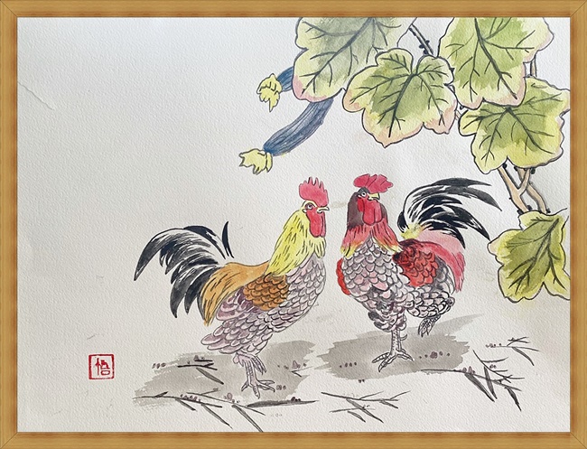 (ヘチマと鶏夫婦―2(水墨画))
