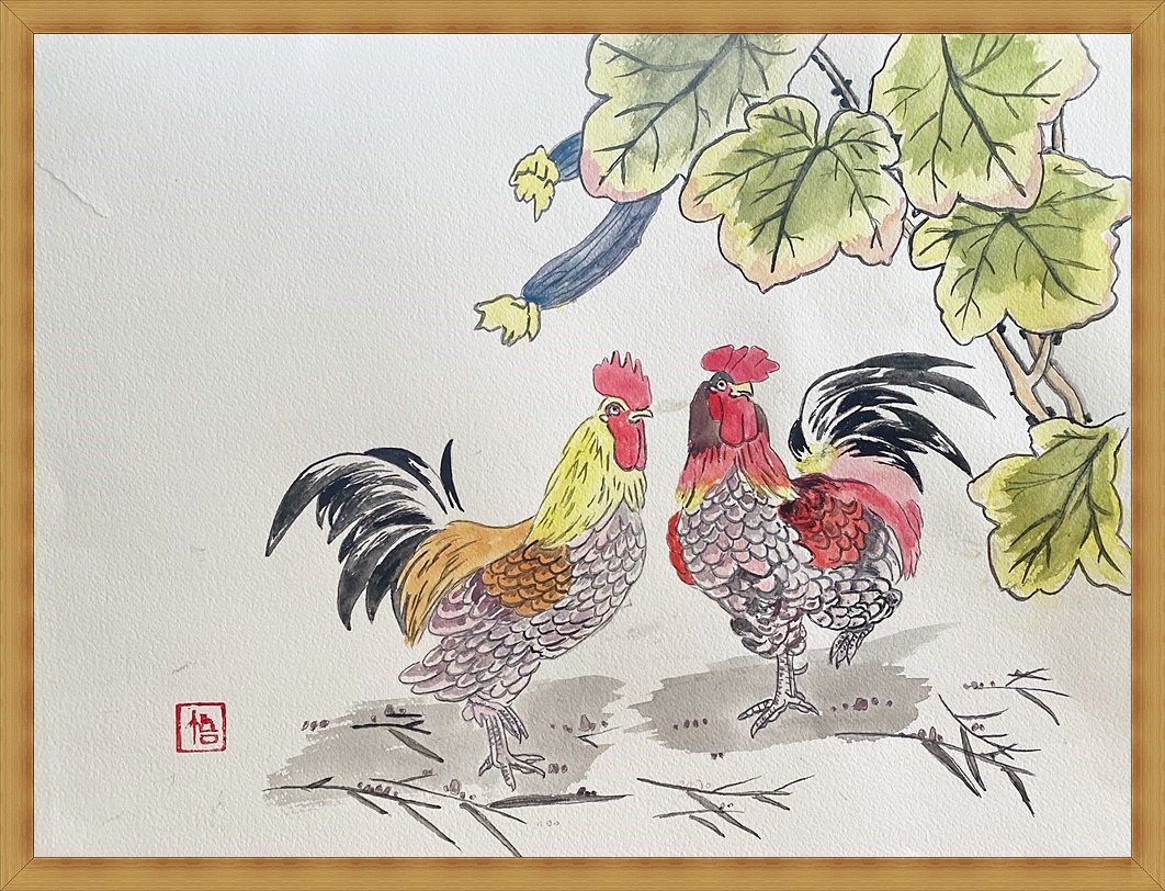 (ヘチマと鶏夫婦―1(水彩画))