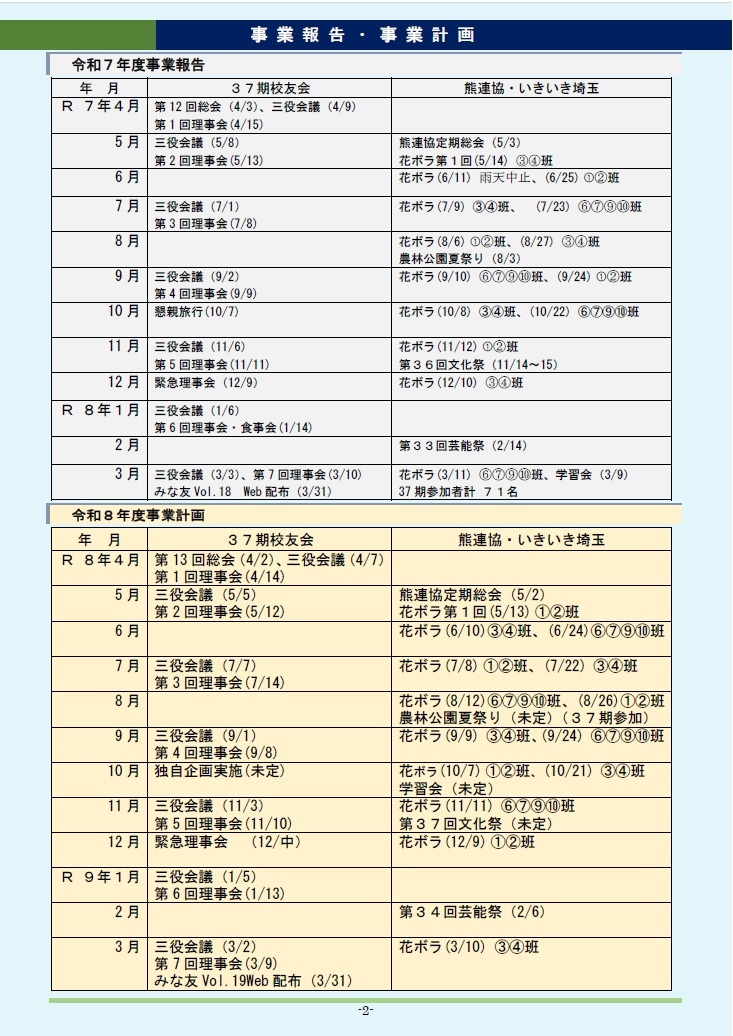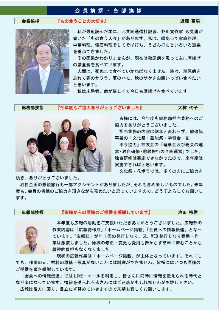 (表紙) (会長・各部長挨拶) (行事報告・計画)