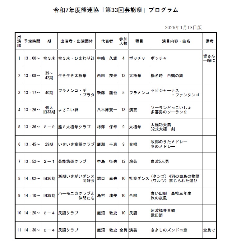 (公益財団法人)いきいき大学は老人大学からいきがい大学、未来大学と約半世紀を経過しましたが第二の人生を迎え高齢社会を理解しどの様な取り組みが必要か等我々の価値を高められる組織は熊連協であります、それには「明るく」「楽しく」「元気よく」が大事であり紐帯関係を強くする事が様々な課題を仲間と克服し、第二の人生を充実する事が可能なのです。