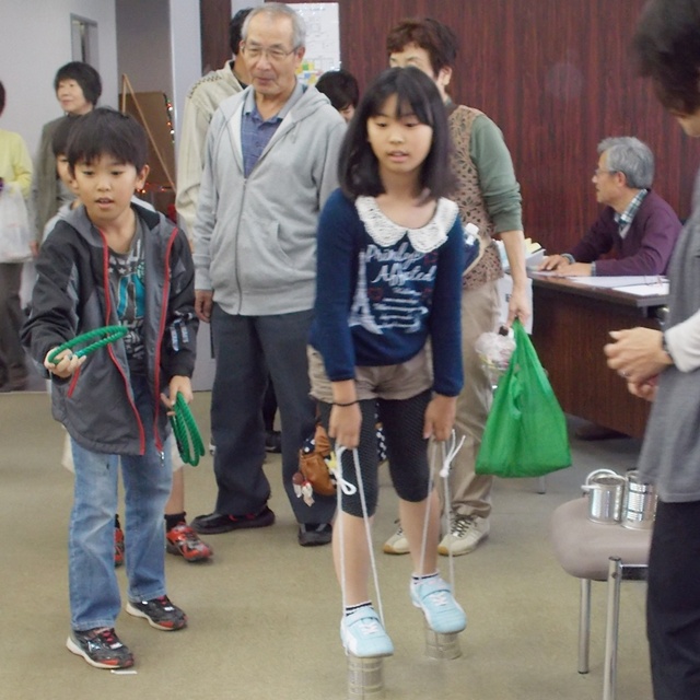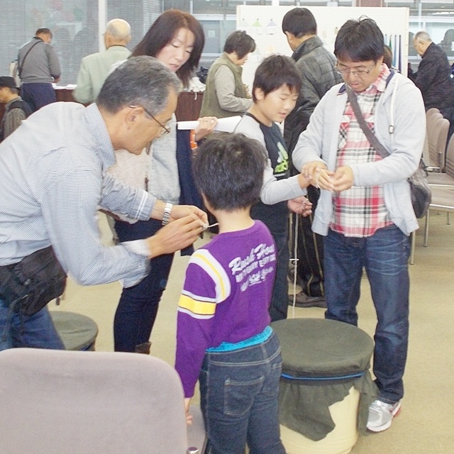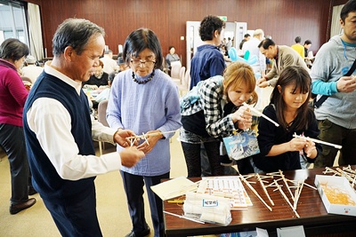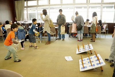 ベーゴマは、樽にゴム布を貼った的に勢いよくコマが回ると歓声が上がった。ベーゴマに紐を巻きつけるのは難しい。小さな手で一生懸命取り組む姿に声援を送る。