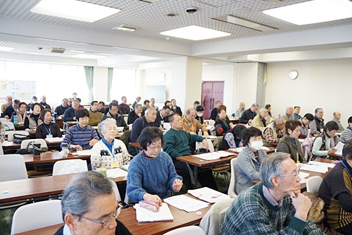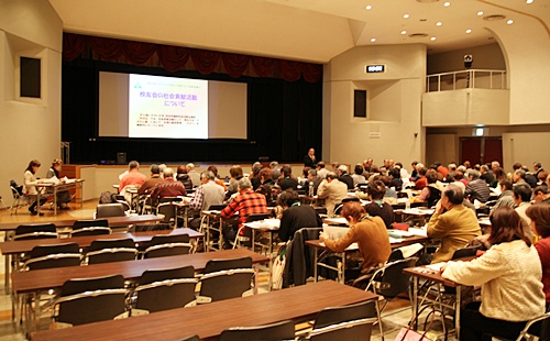 勤労福祉会館において、今年3月に卒業して新たに校友会の仲間入りをする、38期生121名の学生に対して「校友会の社会貢献活動」についてのプレゼンテーションを行いました。
