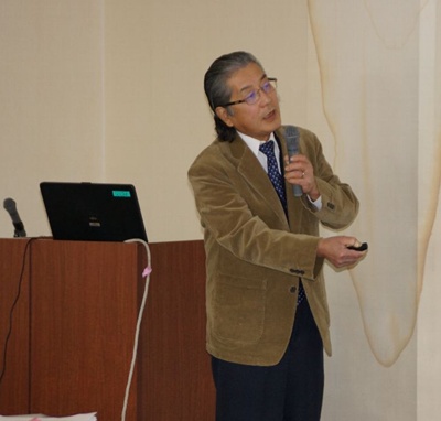 中島会長の挨拶・熊連協紹介の後、先輩の2年制2期新井保夫会長よりプロジェクタを使用して、