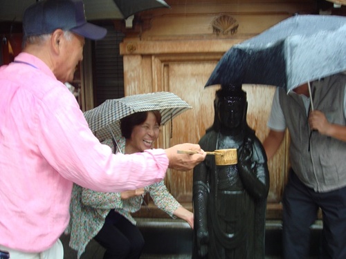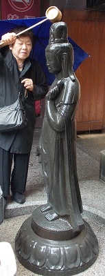 境内の「洗い観音」。この聖観世音菩薩像に水をかけ、自分の悪いところを洗うと治るというで、傘を持ちながらの不自由さもなんのその、観音様に水をかけ布で洗いました。