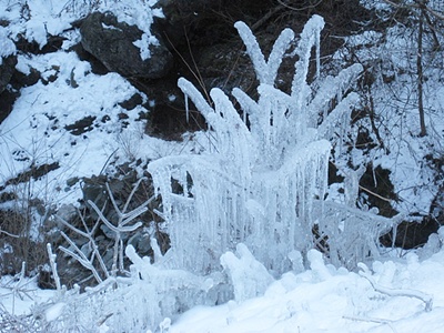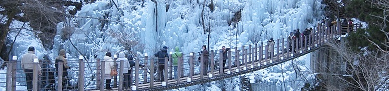 暖冬で氷柱の表面が解け気味とはいえ、寒さが造る巨大オブジェをかわいい吊り橋から堪能しました。