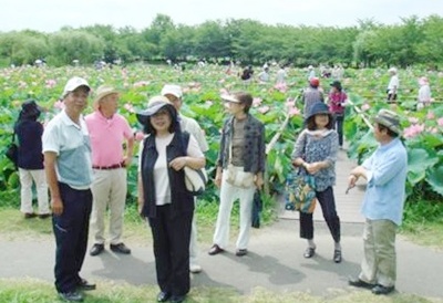 ■7月2日、行田の古代ハス見学、ピンクで高貴な蓮の花が大きく見事に咲きそろい一同感動した後、地上50メートルの塔に登って、下を見ると田植えの終わったばかりの田んぼに見事なアート「古代蓮の精」が描かれており、皆さんまたまた感動、上機嫌で昼食会へ流れ込み楽しい1日となりました。