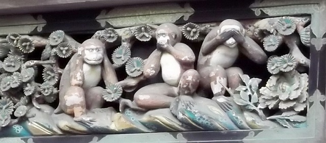 「見ざる、言わざる、聞かざる」の「三猿」他に、厩の側面にもいろいろな猿の彫刻があります。堂者引きというガイドさんの説明で初めて知りましたが、猿を人間に見立てて人間の一生が彫られているとのこと。