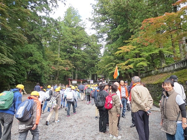 熊谷を出た頃は、すっかり晴れたかに見えた空模様も、栃木に入ったあたりから怪しい雲行き時々霧雨も降ってきました。 いよいよ日光に到着、心配していた雨も降らず傘は不要です。紅葉は期待したほどではなく、まだこれからというところ。最初の日光山輪王寺では、三仏堂の50年ぶりの大修理が始まっており、工事のため見られない堂が等身大に写された幕(?)が出迎えてくれます。壮大です。