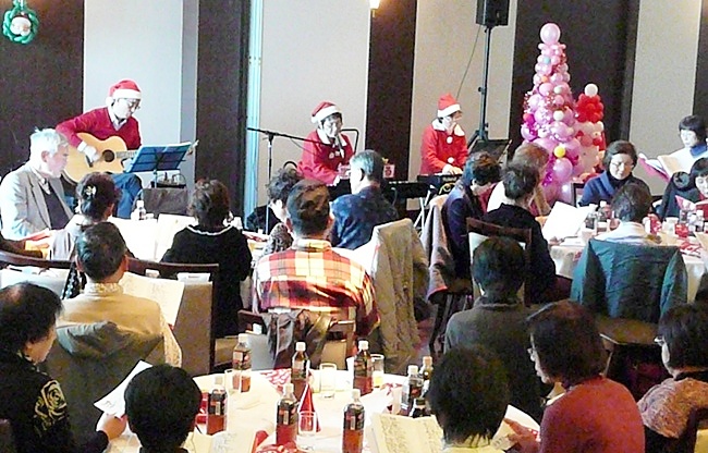 先ずは「ホワイトクリスマス」から始まり、叙情歌あり、歌謡曲あり、フォークソングありの大合唱で大盛り上がりです。