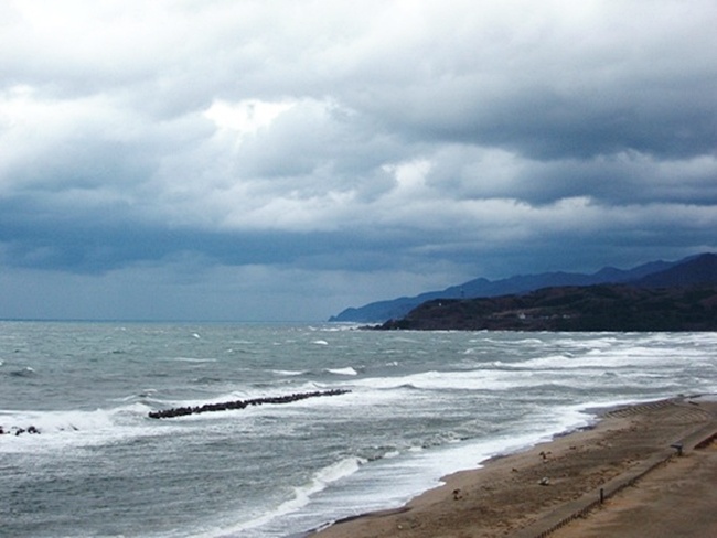 だんだん空模様が怪しくなって大粒の雨が降ってきましたが、村上市の夕映えの宿汐見荘の海に面した窓には夕日は見えなかったけれど、海の上に夕焼け色の雲が見えました。