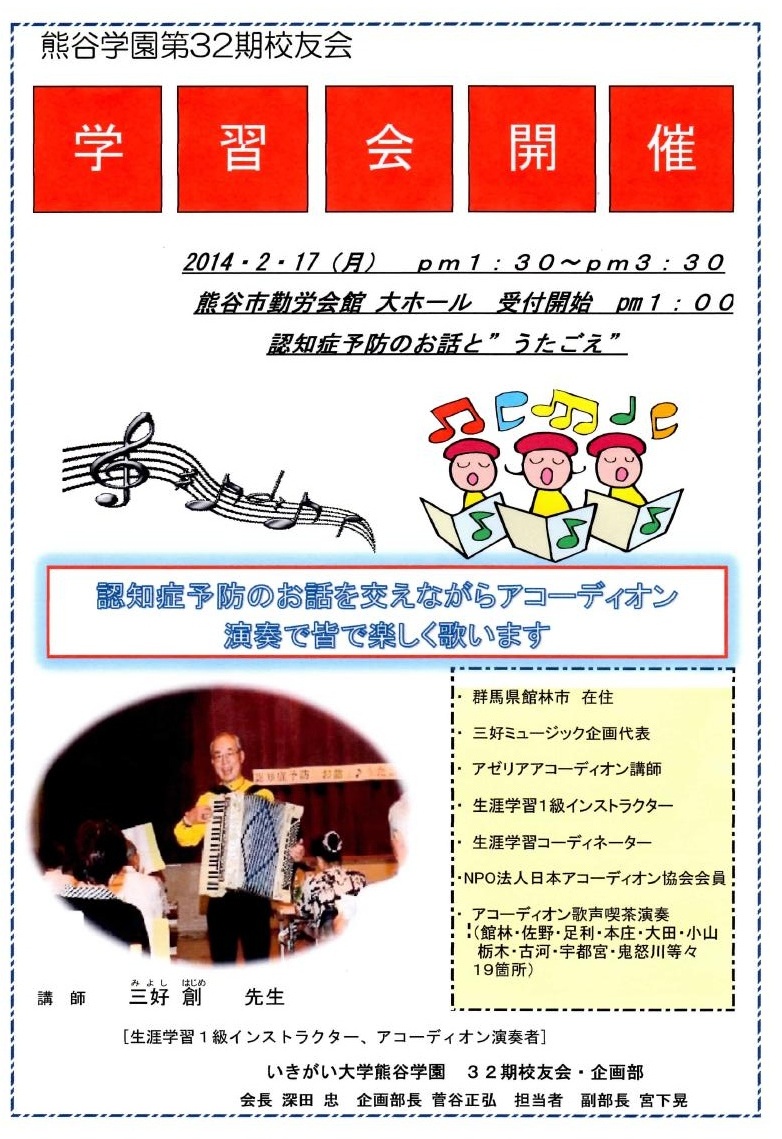 3.演題: 認知症予防と歌声 「お話とアコーデオン演奏による皆で楽しく♪~」