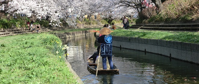 道路から一段低くなっている河岸に下りると、細長い空間がある 両岸の桜がピンク色のアーチとなって川面を覆っている 日の光も柔らかなピンク色に染まっている 川の両岸は住宅地なので車の通りも少なく、静かな空間だ あまり広くない静かな川面の動きに乗って、舟遊びの小舟もゆったりと流れている ここは吹上元荒川 幸せな時間が過ぎて行く・・・・・ |