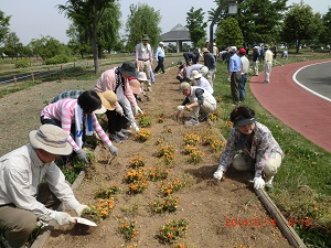 5月14日、2班は、8人が熊谷スポーツ文化公園での花壇ボランティアに参加しました。 今日は暑くなるとの天気予報。 なので皆さん、ペットボトルや水筒を持参していました。 熊連協の会長のあいさつがあって、さあ、作業開始です。 |