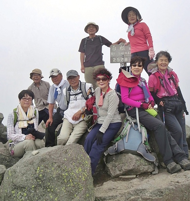 丸沼高原からロープウェーで山頂駅へ、山頂コース(9名)史跡散策コース(11名)に分かれ登山開始です。山頂コースは健脚組、先に出発していきます。樹林帯を抜け稜線へ、砂礫帯の登りとなり全員ばて気味。荒々しい岩を登りきると山頂到着。雲の合間から五色沼も見え満足感いっぱいでした。