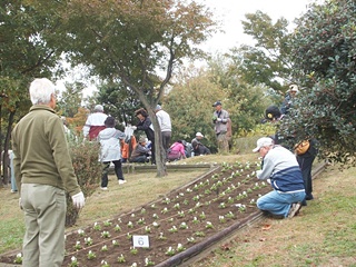 心配しましたが、会長の挨拶、公園事務所の課長の花植え作業の説明を聞いている頃には雨も上がり、 35分間という短い時間で作業は終了しました。