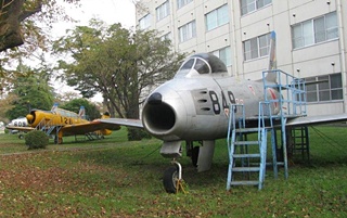 正面に入ると、芝生広場で隊員の訓練中です。何か不気味さを感じます。隊長のお話を聞きながら、先ず目に入ってきたのがジェット戦闘機、翼の先端の赤いタンクに燃料が積んで有ります。ジェットエンジンの出力は馬力(ps)やkwでは無く、推進力(kg)で表すそうです。F-1支援戦闘機の前で記念の集合写真を撮りました。