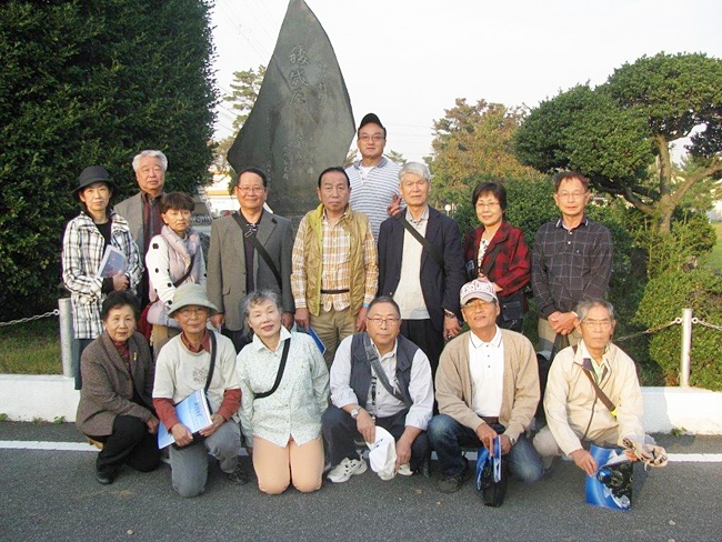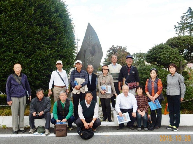 昭和13年熊谷陸軍飛行学校を昭和天皇が行幸した際に御臨行記念として建てられ御稜威ケ原の碑の前で集合写真を撮りました。