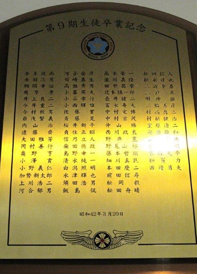 航空自衛隊生徒の卒業記念プレート。16歳以上の男子を技術部門の中堅となる教育をした。"本宮ひろ志"氏は入学はしたが途中で退学しているので総津行銘番に残っていない。
