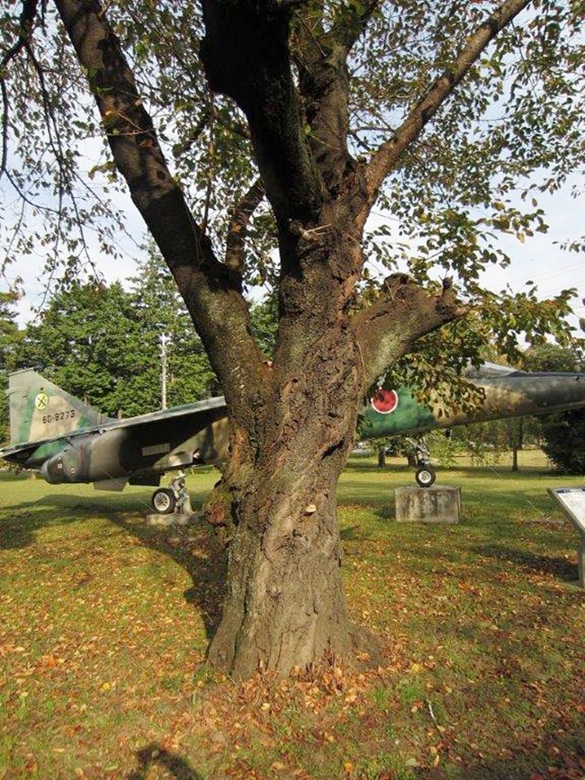 広大な敷地の内に松と桜と真っ赤なツツジのコントラストが撮れました。F-1戦闘機の前で記念写真を撮りました。