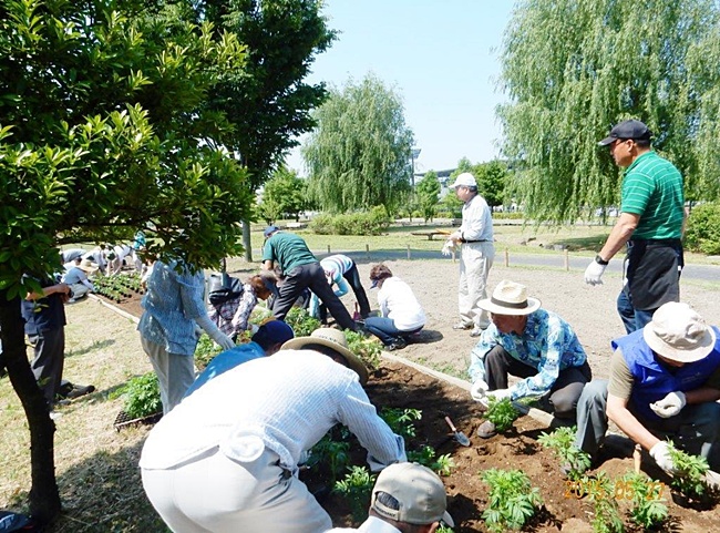 中島熊連協会長のご挨拶があり、今回の参加者は243名との事。熊連協の組織の雄大さには驚きました。決められた花壇ブロック《NO11・NO12》にマリーゴールド250株・ニチニチ草240株・メランポディウム36株を植えるとの事。