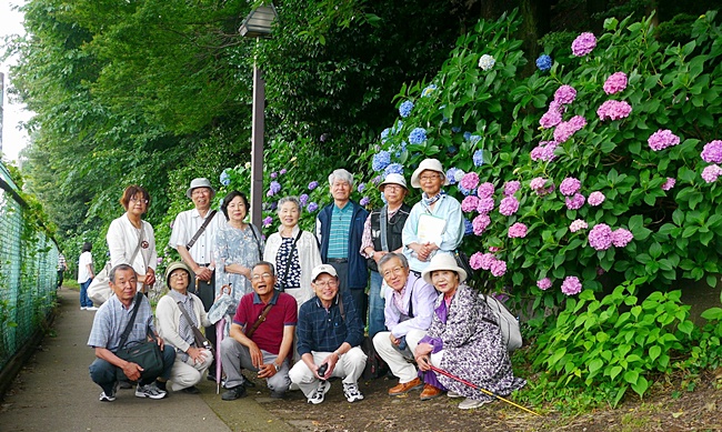 天候は雨模様でしたが、今の季節はあじさいが咲き誇り、雨露で良く映えて艶やかでした。山のふもとで集合写真です。