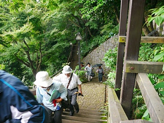 この時は雨は小降りで、皆さん階段の上り前で元気です。この後、つづら折りの階段を休み休み上りました。