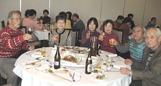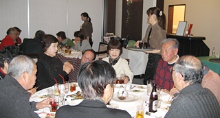 各テーブルでは普段、顔と名前の一致しない人らが自己紹介するなど、大いに親交が進み、有意義な会となりました。会員の今後ますますの活躍と健康を願い、午後2時、再会を期し、集合写真を撮ってお開きとなりました。