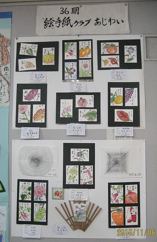 絵手紙は棚澤はつ江(7班)、油井民代(10班)、加藤幸子(3班)、菊池博明(3班)、金井喜代子(3班)、市川錦子(2班)、新井綾子(2班)、藤巻ハル(9班)、落合浪江(3班)、岩田恵子(2班)の10名の作品が飾られました。
