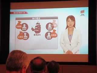 時間までロビーで待ち、案内の女性について2階に上がります。始めは会議室での紹介ビデオ視聴です。株式の起こり・東京証券取引所の起こり・大阪証券取引所は今、東証と一緒に分担を変えJPXの一員になったこと等などを伺いました。