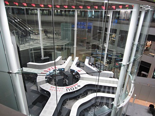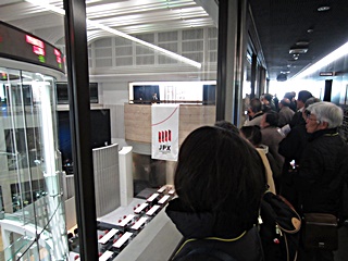 ビデオ終了後は見学回廊から"マーケットセンター"を見学します。ガラスの円筒の中で少人数の人がディスプレイ画面とにらめっこしています。この狭い中が世界有数の東京証券取引所の取引をしている現場です。円筒の最上部には会社銘柄と株価が目の回る速さで回っています。色で上げ下げを示すそうですが、この日は緑の下げが目立ちました。