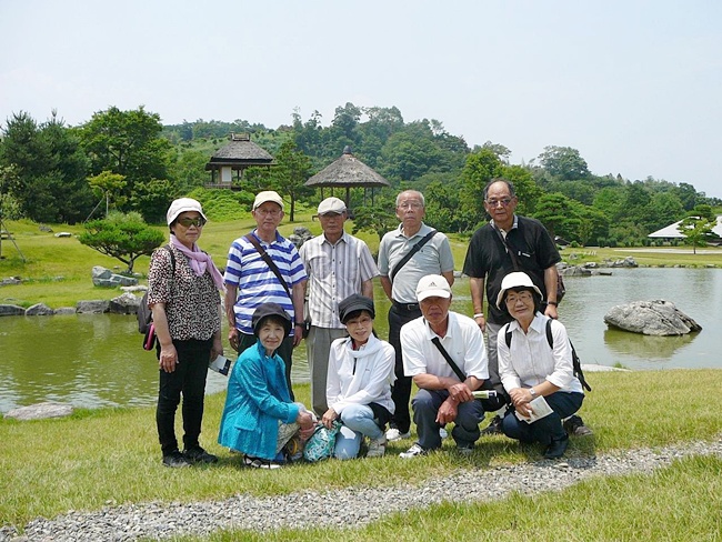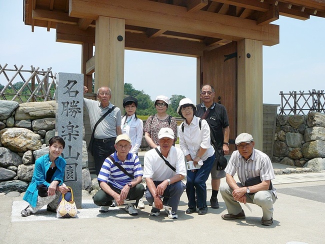 その水は武家屋敷の庭を流れたり、藩邸や町屋などの生活用水となったり、鏑川にそそぐ下流域では田畑を潤おす農業用水へ利用するように造られています。写真は、先人の知恵、雄川堰に面した武家屋敷跡の井戸・住居そして皆の集合写真です。先人の偉大な功績に感動です。 楽山園は、小幡藩二万石の藩邸に付属する群馬県内唯一の大名庭園です。江戸時代初期、織田信長の次男織田信雄によってここに城下町を築く際に造られた庭園で、7年と数万両を投じた池泉回遊式庭園です。楽山園という名前の由来は、「知者ハ水ヲ楽シミ、仁者ハ山ヲ楽シム」という論語の故事から名付けられたと言われています。(現在の維持管理費用は東京に住む大金持ちの方の寄付によるとのことです。・・・感謝、感謝です)