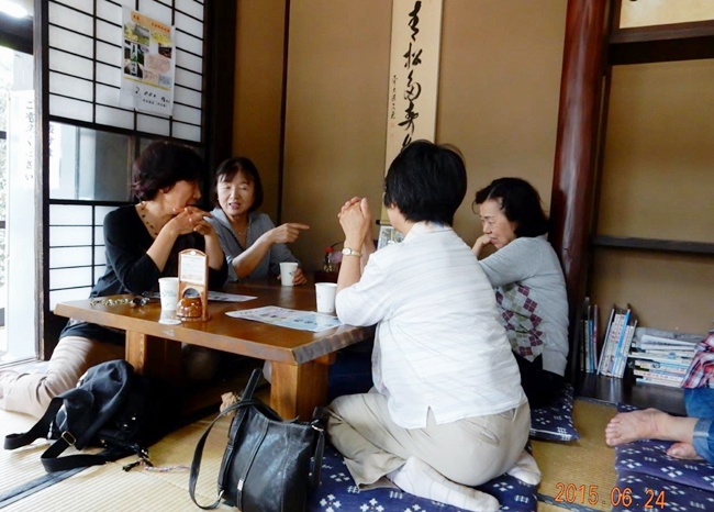 8班の平川さんの道案内で10分程で到着。長屋門をぬけると、なんともいえぬ〝やすらぎ〟なつかしさを感じるのは建物に木材や土などが使われ、匠(たくみ)の柱と自然がうまく調和されているからでしょう。