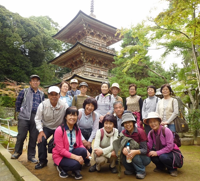 百穴の裏山を越して歩き、北向き地蔵と八坂神社でお参りしてから、吉見観音音へ、坂東11番の札所です。観音菩薩にお参りして、三重の塔で記念写真を撮り、