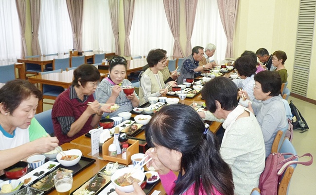 フレンドシップ・ハイツよしみで、用意された「農家定食」を食べながら談笑し 親睦を深めました。