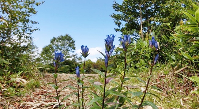 野反湖を左下に臨みながらの登り、両側にはマツムシソウやエゾリンドウ等の高山植物が可憐に彩っていました。