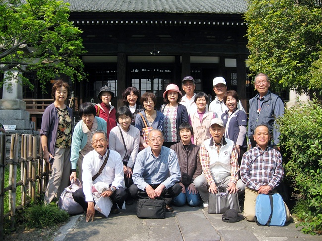 直実の甲冑や剣、陣刀など寺宝は見ることが叶いませんでしたが、蓮生の大きな位牌に手を合わせ、堂前で記念撮影の後、蓮生のお墓にお参りしました。