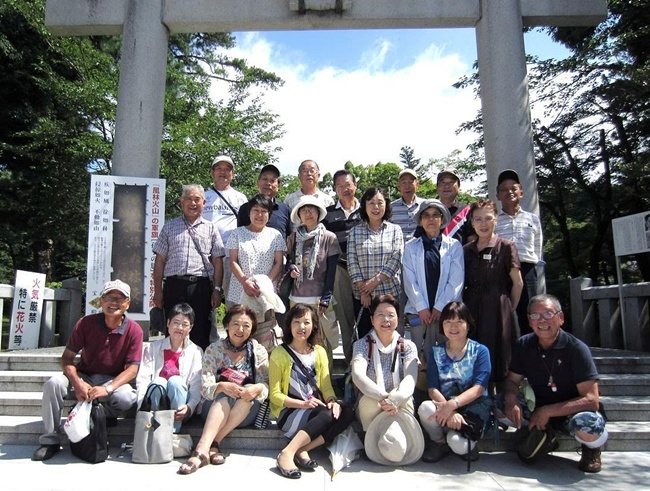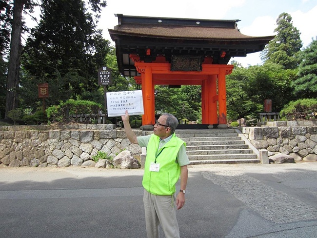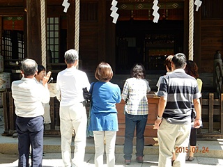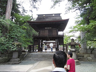 高速を一宮御坂ICで降り、先ずは武田神社です。走行が順調だったことで、到着は予定時刻より約30分早くなりました。事前にお願いしています観光ボラに電話連絡をしたら、丁度バスに乗る所とのこと、そうです初狩PAに休憩を追加した時に、予定時間を連絡しませんでした、こちらが悪いのです。少しの待ち時間で鳥居の前にて集合写真の撮影です。