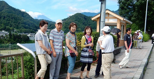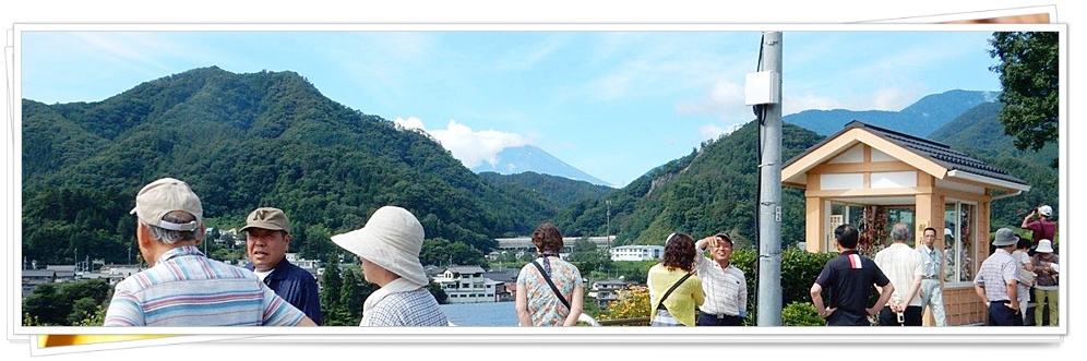 生憎、頂の半分は雲に隠れていましたが御姿を拝むことが出来ました。美しい女性陣の後ろに、恥ずかしそうな富士山が背景に写っています。