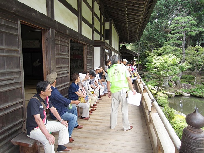 夢想国師の築庭した庭を見学、説明を座って受ける方々、暑さでの疲れが出ています。ガイドの久保田さん暑い中、お世話になりました。