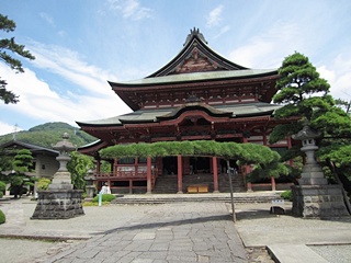 1754年に失火により七堂伽藍が灰燼帰し、1796年の徳川時代に再建されたとのこと。金堂の紋章は武田菱があります。目立たない正面瓦下の武田菱の上に、しっかり徳川葵紋が有ります。ガイドの大西さんとはここでお別れです、お世話様でした。