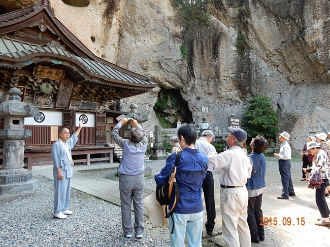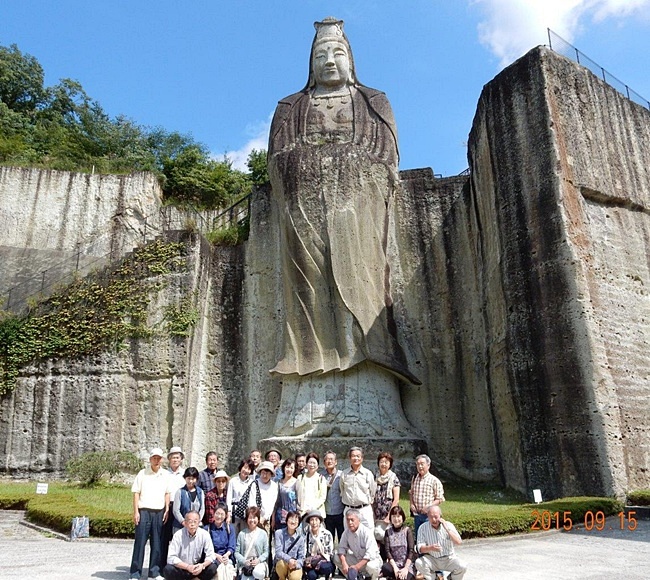 当日は天候に恵まれ、予定どおり最初の目的地大谷寺・日本最古の石仏がある大谷観音に到着、住職さんの話を聞きながら隣の平和観音前へ移動。